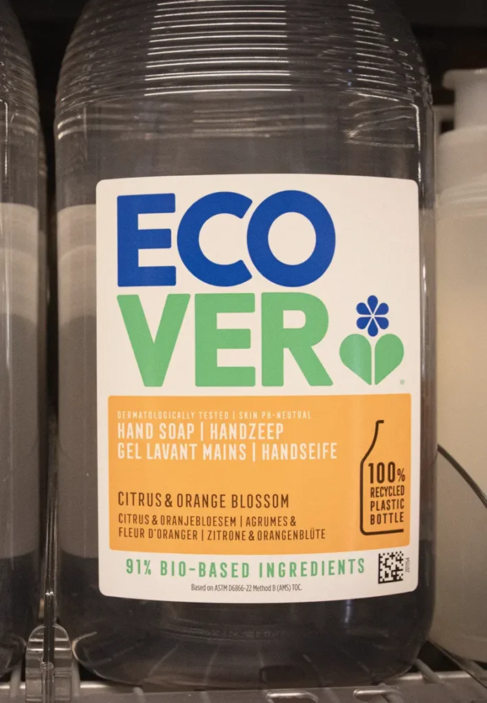 Behalve milieuvriendelijke schoonmaakmiddelen heeft Ecover ook biologische handzeep. Deze is huid-pH-neutraal, met een waarde van ongeveer 5,5.